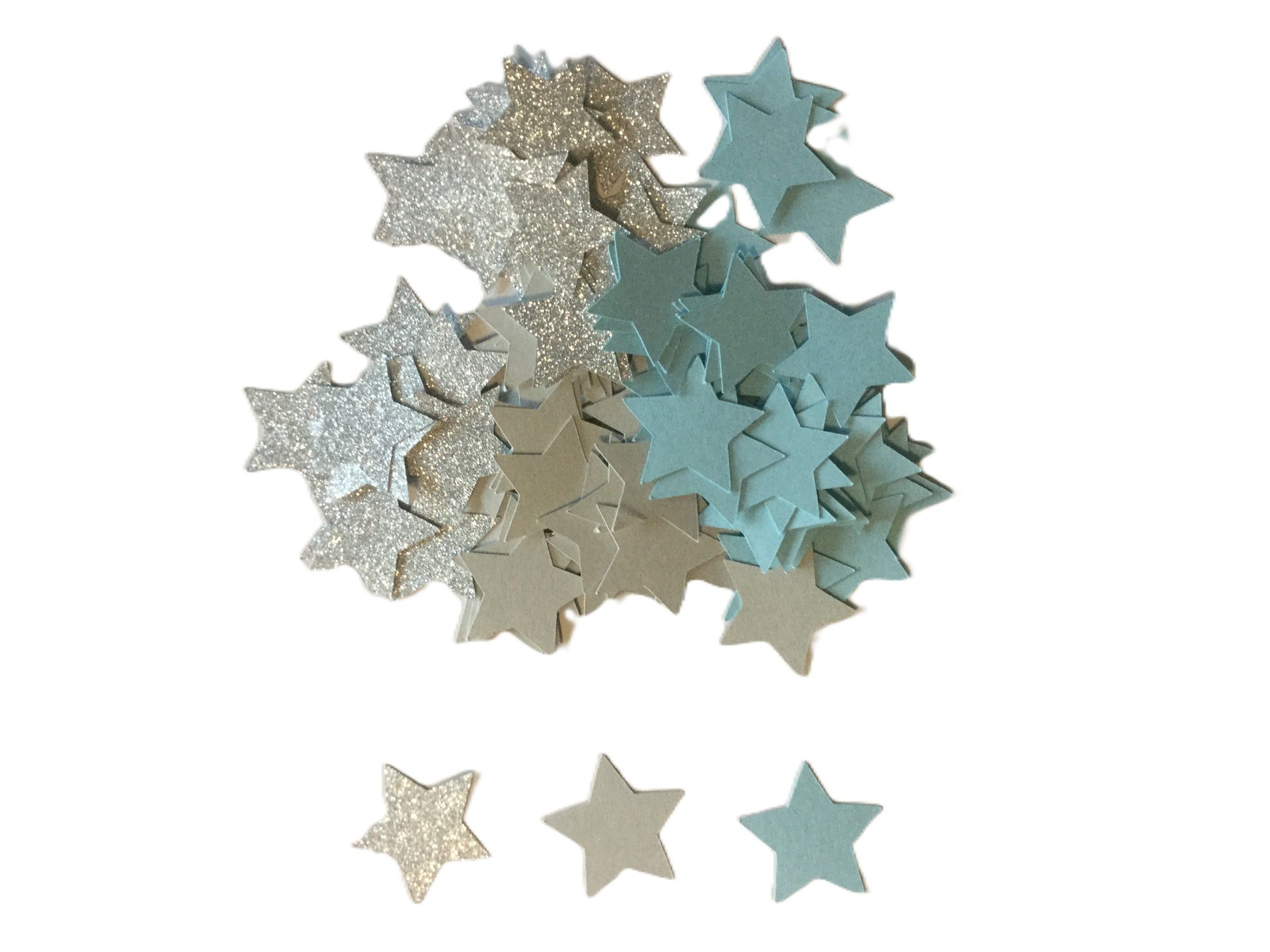 You are looking at 100 blue, gray and silver glitter star confetti pieces.
