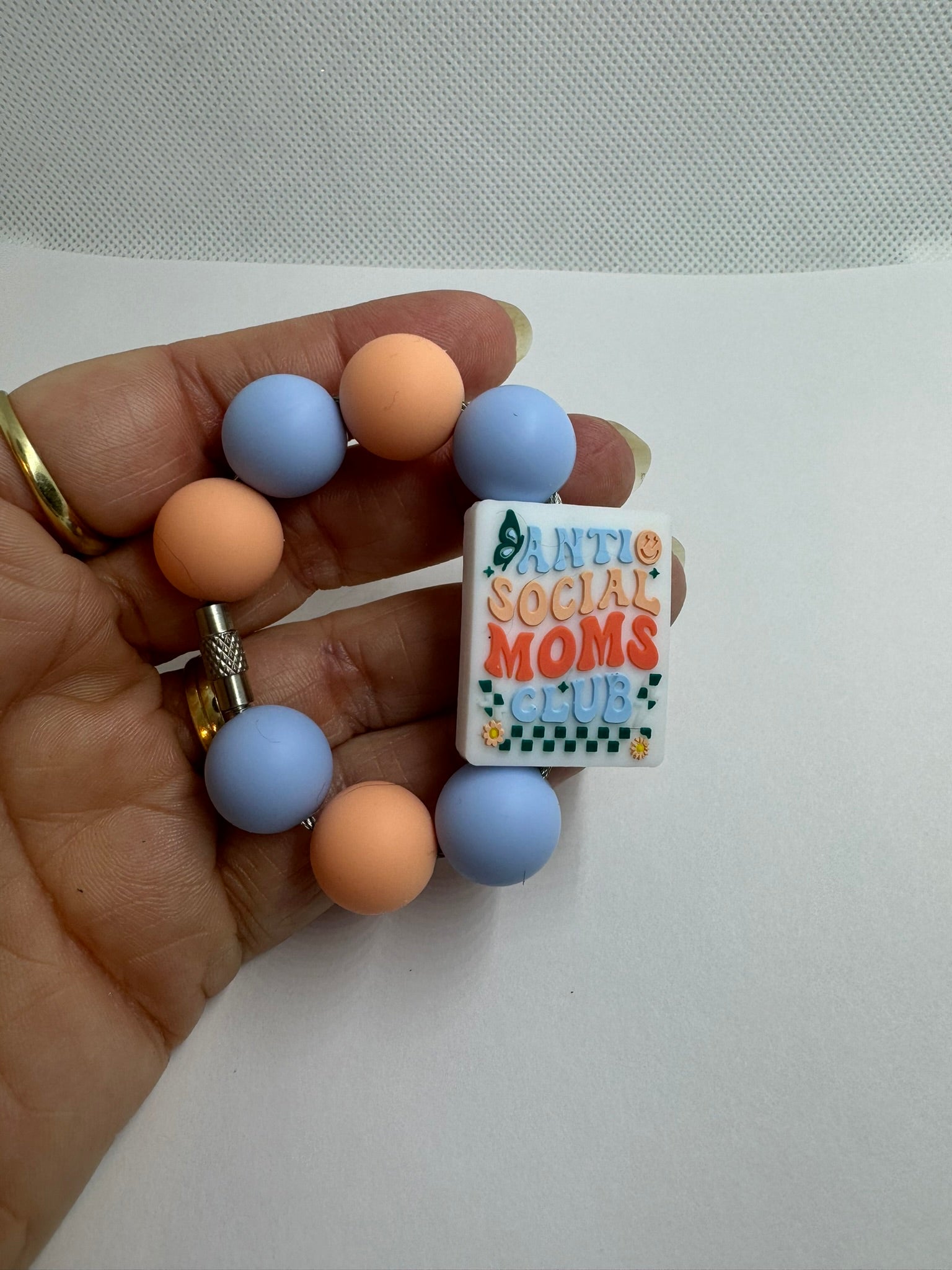 The charm is made using a 6" cable wire. The charm is made with 15mm beads. The charm includes 4 blue, 3 peach and one anti social mom club focal bead