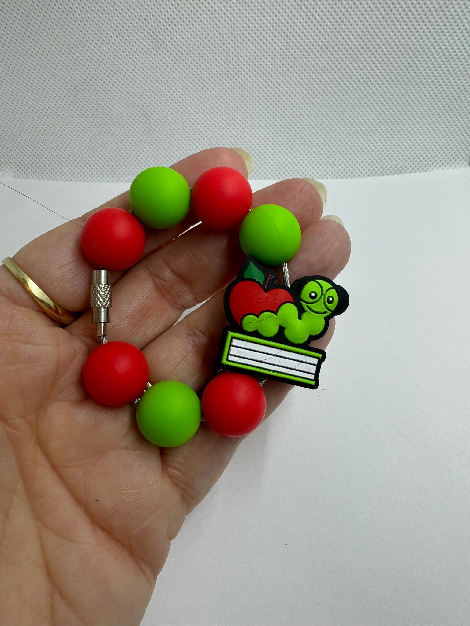 The charm is made using a 6" cable wire. The charm is made with 15mm beads. The charm includes 3 green, 4 red and one book worm focal bead