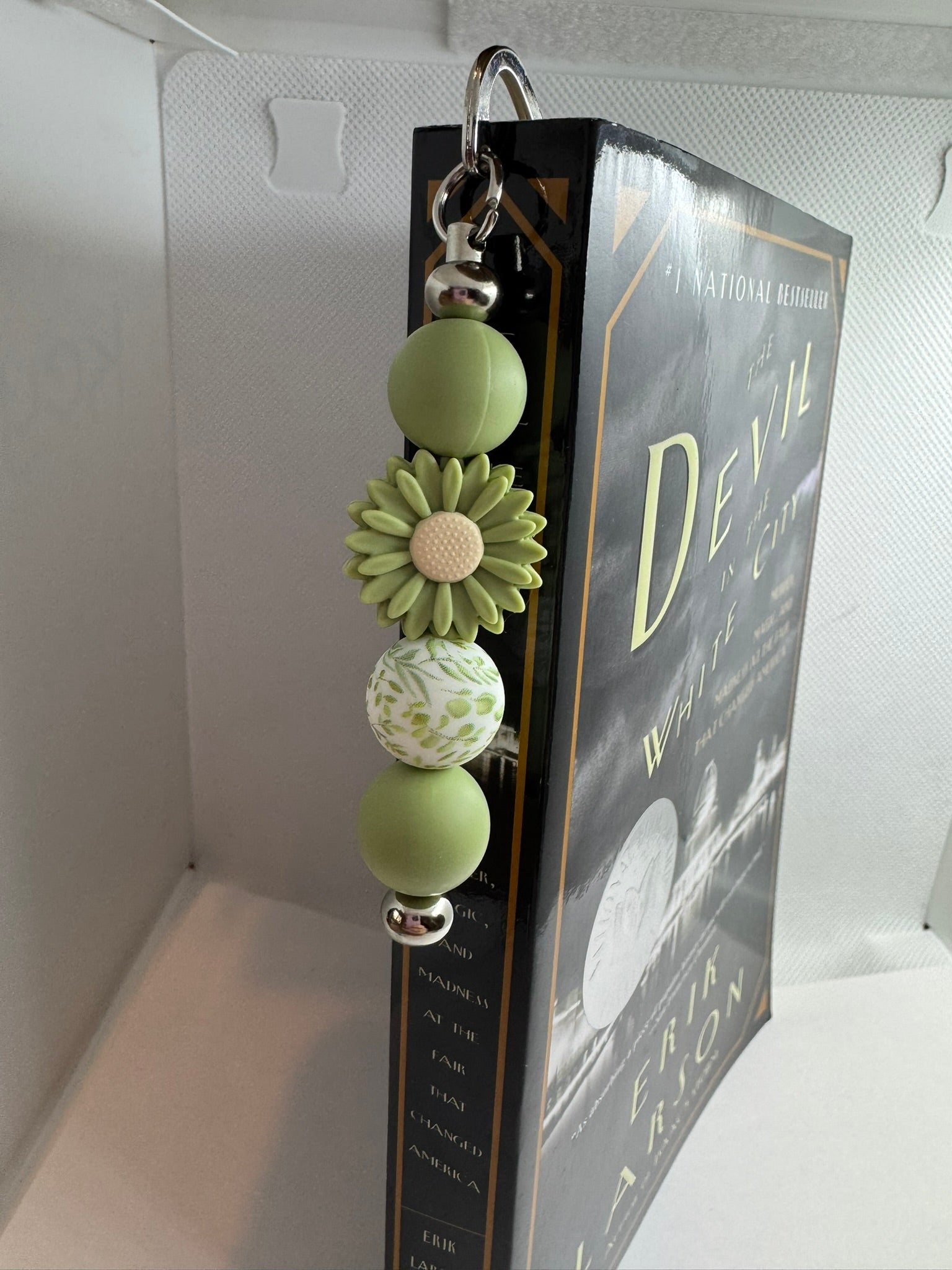 The bookmark contains 2 green, 1 printed bead and one green daisy focal bead