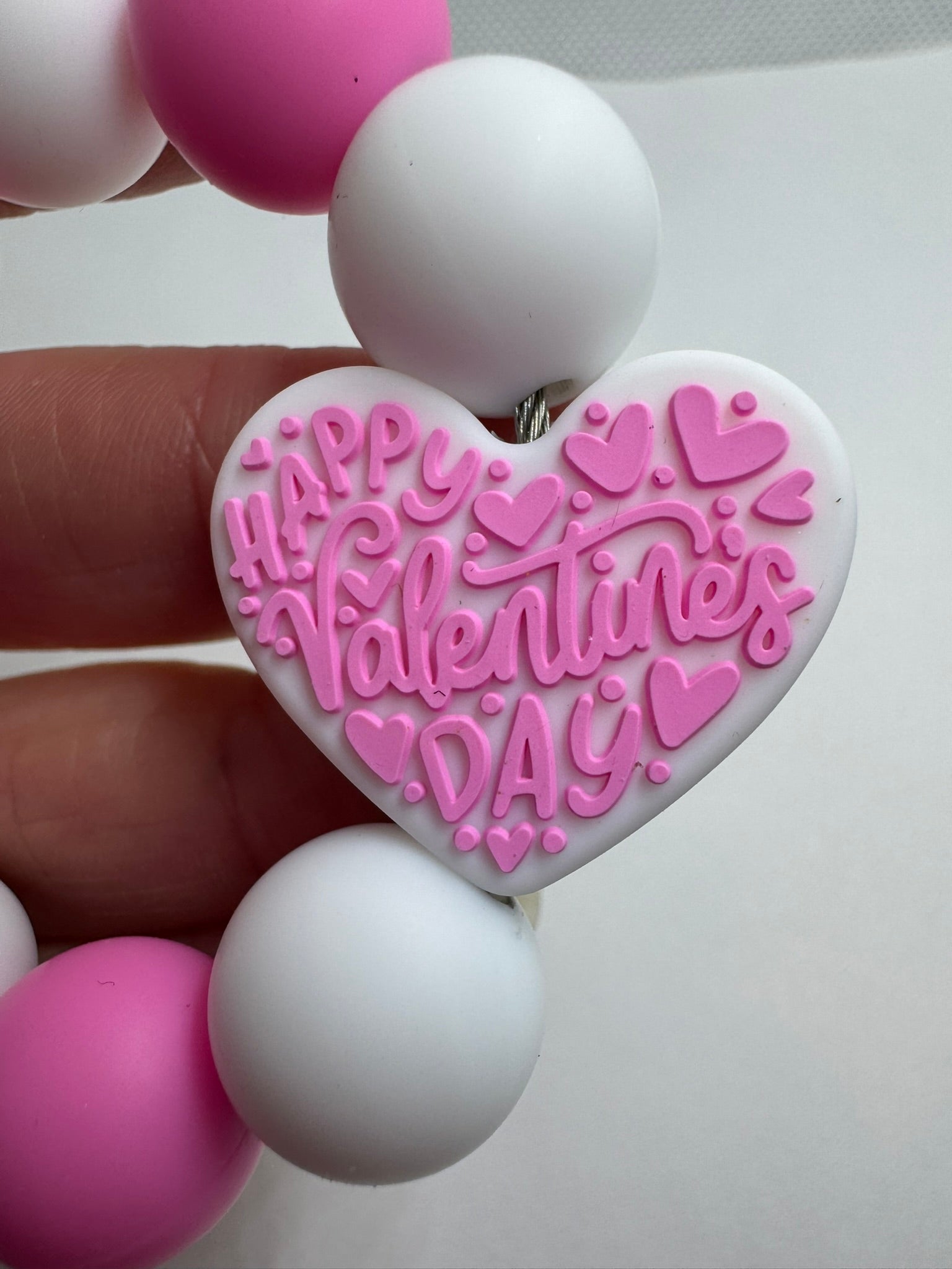 The charm is made with - 15mm beads. The charm includes 4 pink, 4 white and one heart focal bead.