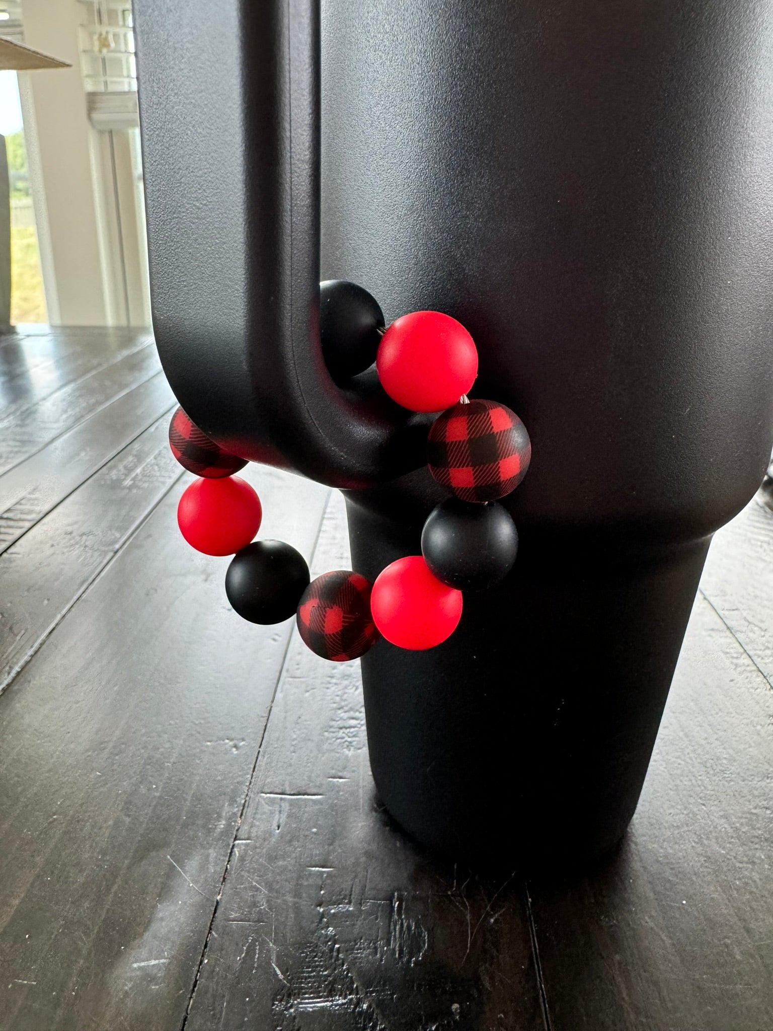 The charm is made using a 6" cable wire. The charm is made with 9 - 15mm beads. The charm includes 3 red, 3 black and 3 red/black check