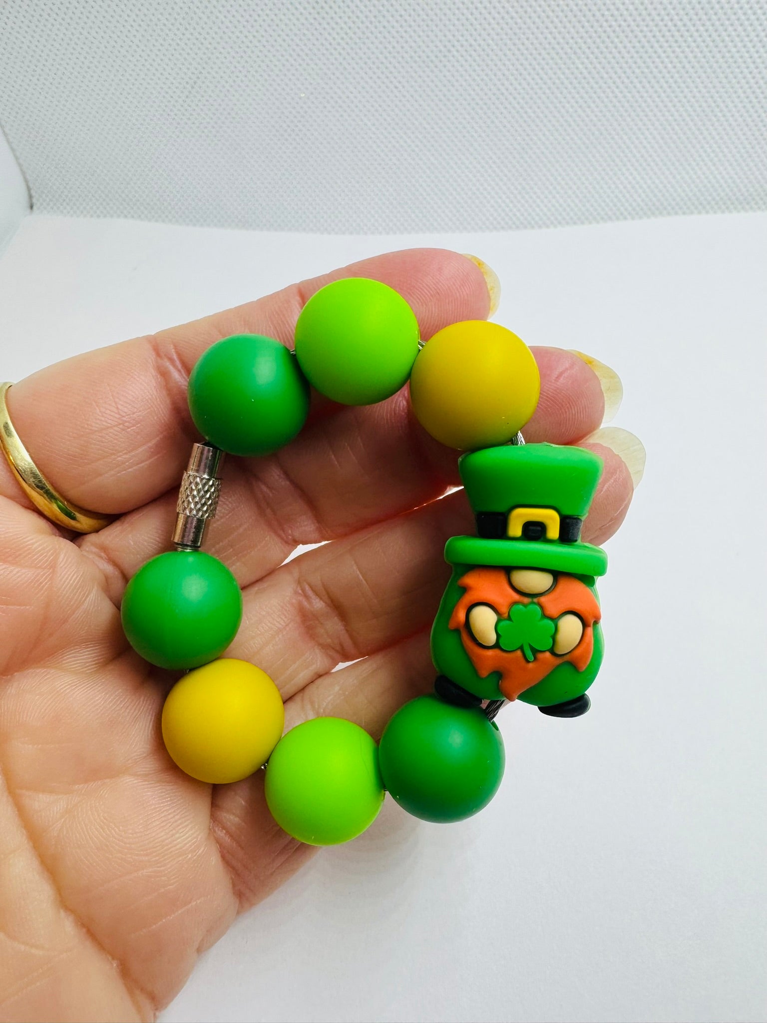 The charm is made with 15mm beads. The charm includes 3 green, 2 light green, 2 gold/yellow and one 3d leprechaun focal bead