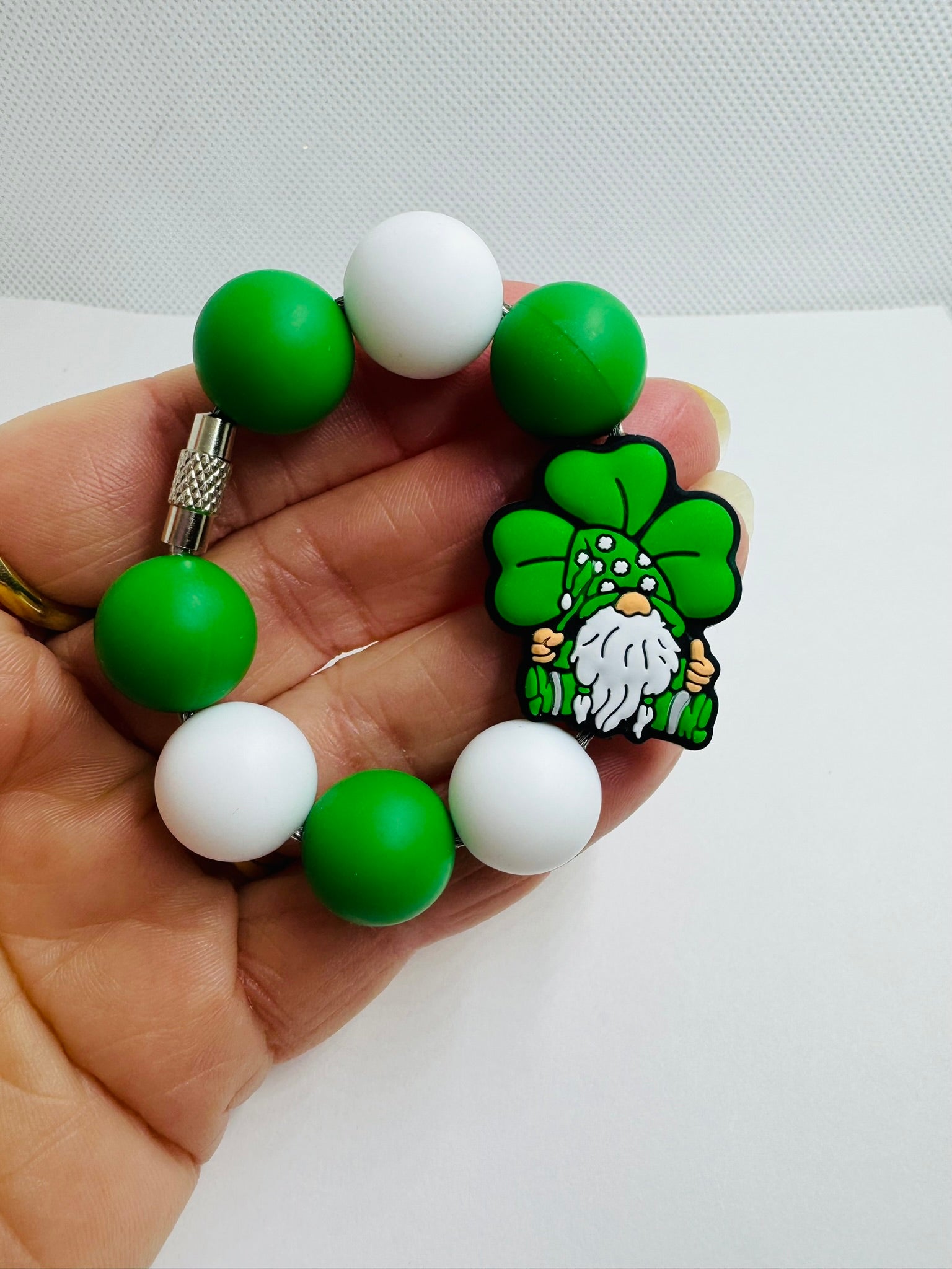 The charm is made with 15mm beads. The charm includes 4 green, 3 white and one shamrock gnome focal bead